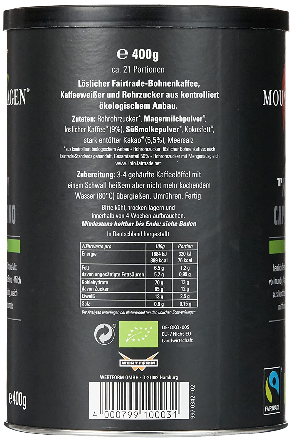 Willkommen bei Special Fitness! Wir freuen uns dir den Mount Hagen Cappuccino in der praktischen 400g Dose vorzustellen. Dieser Cappuccino ist die feine Mischung aus hochwertigem Kaffee und cremigem Milchschaum, perfekt für alle, die eine vollmundige Kaffeespezialität zu schätzen wissen. Mit dem Mount Hagen Cappuccino kannst du ganz einfach den Geschmack eines frisch zubereiteten Cappuccinos direkt zu Hause genießen. Wenn du eine hochwertige Kaffeespezialität suchst, bist du bei Special Fitness genau richtig.Mount Hagen Cappuccino – Genießerqualität für wahre KaffeeliebhaberDer Mount Hagen Cappuccino bringt dir die perfekte Balance aus kräftigem Kaffee und feinem Milchschaum. Jede Tasse liefert dir den herrlichen Geschmack und das einzigartige Aroma, das du von einem erstklassigen Cappuccino erwarten kannst. In der praktischen 400g Dose verpackt, ist er ideal für deinen täglichen Kaffeegenuss. Bereite den Mount Hagen Cappuccino nach deinen Vorlieben zu und erlebe den besonderen Moment einer echten Kaffeepause.Vielseitige Genussmomente – Mount Hagen Family CappuccinoDank seiner hochwertigen Zutaten und der durchdachten Zubereitung bietet der Mount Hagen Family Cappuccino die unterschiedlichen Einsatzmöglichkeiten. Ob am Morgen für den perfekten Start in den Tag, als entspannende Pause am Nachmittag oder als krönender Abschluss eines gelungenen Essens – dieser Cappuccino passt zu jeder Gelegenheit. Seine ausgeglichene Rezeptur macht ihn zur idealen Wahl für alle Kaffeeliebhaber, die Wert auf Geschmack und Qualität legen.Mount Hagen Cappuccino kaufen und Genuss erleben!Der Mount Hagen Cappuccino besticht durch seine Qualität und sein reichhaltiges Aroma. Schon eine Tasse zeigt dir die Welt des exzellenten Kaffeegenusses und lass dich von ihm entführen. Entdecke jetzt die Vorzüge des Mount Hagen Cappuccino und bestelle deine 400g Dose direkt bei Special Fitness. Gönne dir und deinen Lieben einen besonderen Genussmoment und genieße die fantastische Qualität des Mount Hagen Family Cappuccinos! Mount Hagen Family Cappuccino – Qualität, der man vertrautMit dem Mount Hagen Family Cappuccino bekommst du nicht nur ein Produkt, das hervorragend schmeckt sondern dir eine Balance in deinem Alttag bringt. Die sorgfältige Auswahl der Zutaten und die schonende Verarbeitung garantieren dir ein hochwertiges Kaffeeerlebnis. Vertraue auf die bewährte Qualität des Mount Hagen Cappuccinos und mach ihn zum festen Bestandteil deiner täglichen Genussmomente.